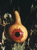To create a white or colored background , sponge on one or two coats of exterior latex paint. Be very careful not to let any paint drip into the gourd or clog the drainage holes. Allow the gourd to dry thoroughly. Trace your design on to the gourd and paint with acrylic paints. Erase all tracing lines when done. Finish with a good coat of high-gloss spar urethane without allowing any inside the gourd or to clog up the drainage holes.